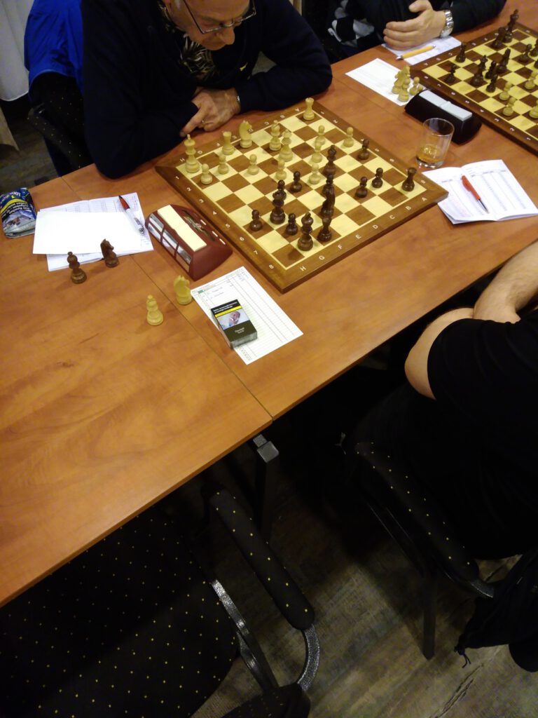 Dit is de stelling na 19 zetten. Voor de goede orde, zwart is hier aan zet. De paarden van wit nemen veel ruimte weg bij de tegenstander. Dhr. Hoenderdos bleef nog lange tijd weerstand bieden, maar ging uiteindelijk toch de bietenbrug op.