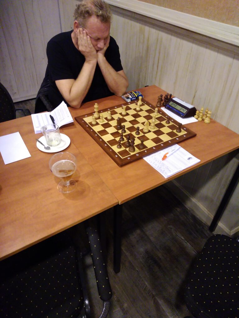 Sssssssssst, ik ben aan het schaken. Diepe concentratie bij Henri Stouten die een puike pot speelt tegen Paul Grolman. De foto laat de stelling zien op zet 20.
