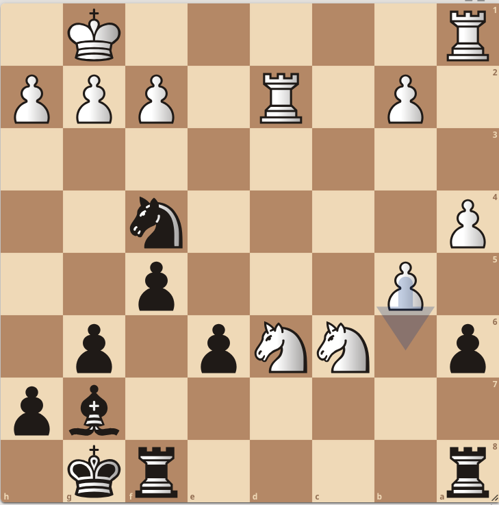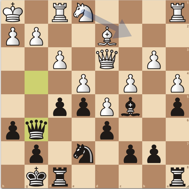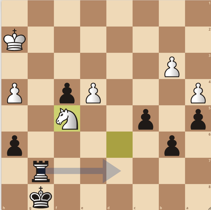 We zitten inmiddels op zet 43. De achterstand voor wit is opgelopen tot 5.3 punten. Over en uit zou je denken. Maar in plaats van dat de toren naar de open d-lijn gaat, kiest Grolman voor Tg6. En ineens staat wit nu +1.0. Na de vork van het paard Pe7+, verliest Grolman zijn voorsprong.