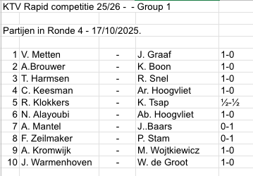 Vanwege een groot aantal deelnemers dat niet aanwezig kon zijn, speelden maar 21 spelers mee met de rapid competitie. En er is goed nieuws! We hebben er weer een nieuw lid bij. Of eigenlijk oud, want hij is al eerder lid geweest van K.T.V. Jan Baars is weer terug op het oude nest. Welkom Jan.