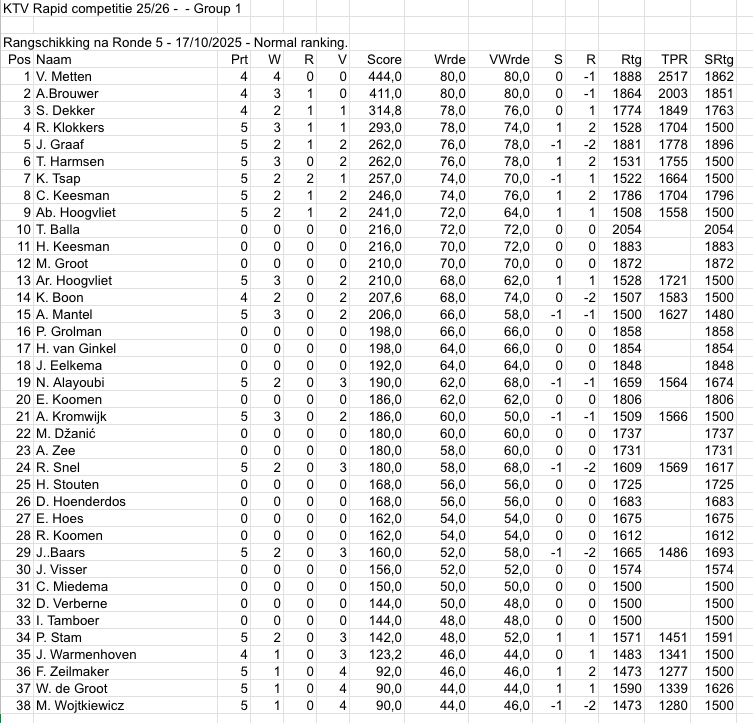 Wat opvalt in de ranglijst zijn de hoge noteringen van de jeugdige spelers. Dekker, Klokkers, Harmsen, Tsap en Abel Hoogvliet zijn allemaal in de top tien te vinden. En dan is er natuurlijk ons snelschaakwonder Vasco Metten die met 4 uit 4 (vanwege een bye in de eerste ronde) zijn reputatie waarmaakt en de lijst aanvoert.