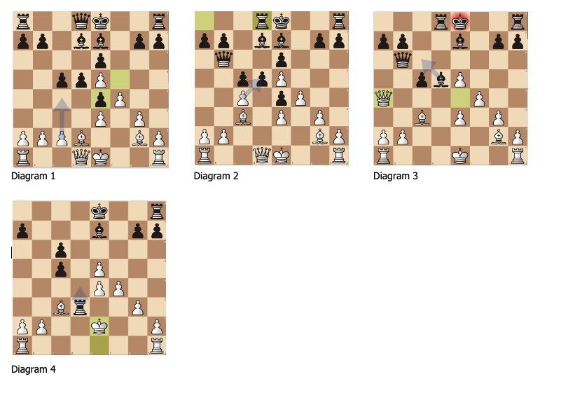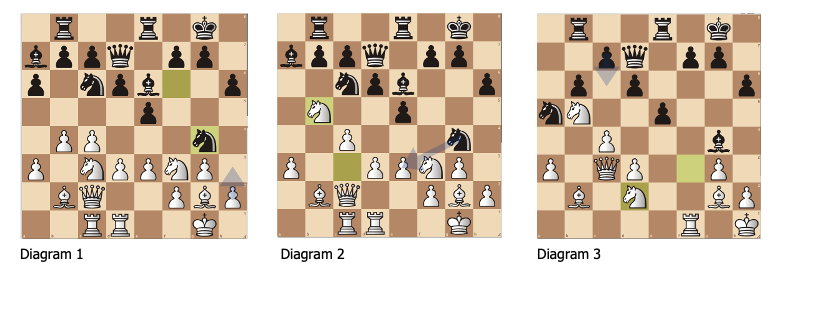 Een andere knappe overwinning werd behaald door Axel Zee op Chris Keesman.In diagram 1 speelt Axel op zet 12 c4. En wit heeft hier een licht voordeeltje. Na 12. c4,Db6; 13. Lc3, Td8; (diagram 2) 14. cxd5, exd5 komt Zee alsmaar beter te staan. 15. Dxb5!, Le6; 16. Dxe4, Ld5; 17. Da4+. (diagram 3) Axel had bij deze zetten al voorzien dat de dame op a4 met schaak de ontsnapping was. 17. …,Dc6; 18. Dxc6, bxc6; 19. e4, Lc4; 20. Lf1, Ld3; 21. Lxd3, Txd3; 22. Ke2 en Keesman geeft er de brui aan. Knap gespeeld van Zee die hierdoor naar plek 3 stijgt, net achter zijn collega voormalig Groenezesser.