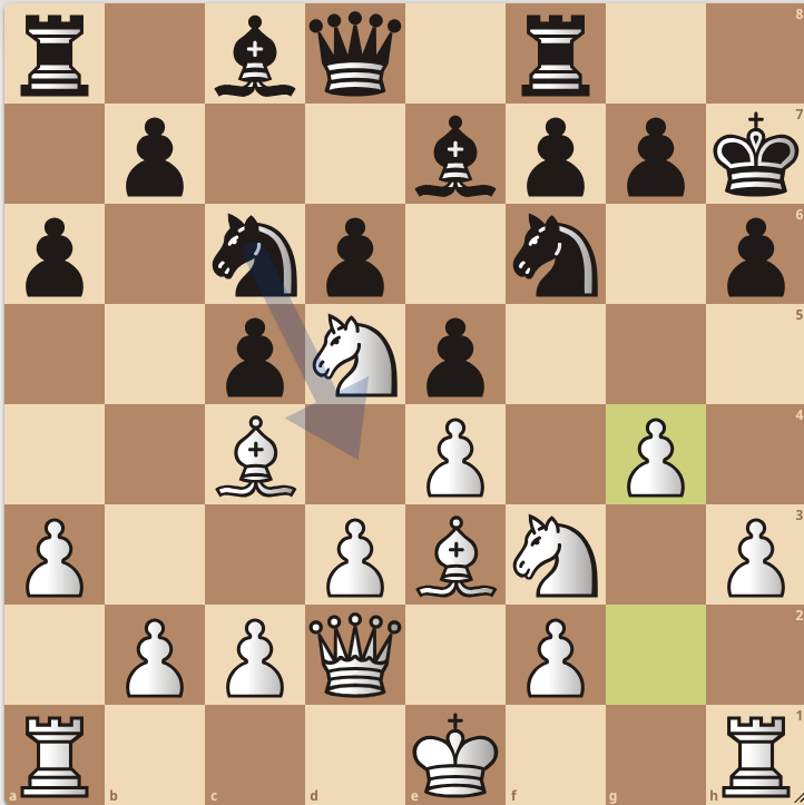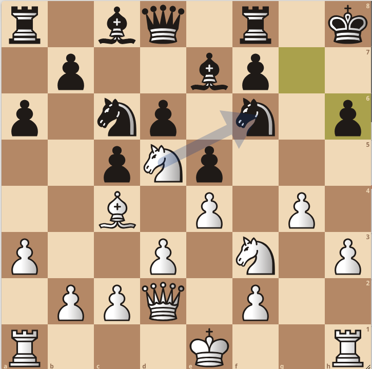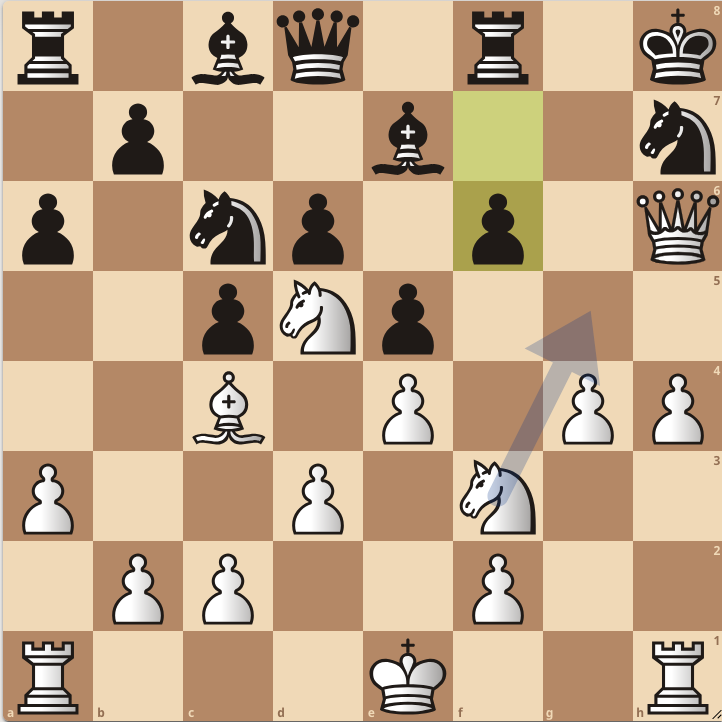 Maar Boon speelt op zet 13 Dxh6+, en na Ph7 is volgens de engine van Lichess alles in evenwicht. Maar ja, zo’n dame in je achtertuin vlak bij je koning, dat geeft toch een heel onprettig gevoel. En dat gaat in je bloed kruipen, zo ook bij Ace. Zet 14. h4, f6; 15. g5, en Ace capituleert.
