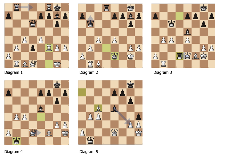 22.Kg2,Txd3; 23.Dxd3,Td8; 24.De2 (diagram 2),Td7; 25.Le3,Dc6; 26.Lf2,Le5; 27.b4,Td2!? (diagram 3). Mooi gevonden van Tom, maar niet per se de beste voortzetting. Wit staat hier ineens +1.3. Na 28.Dxd2,Dxe4+; 29.Kh2,Dxb1 (diagram 4) sla ik op zet 30 Lxa7, waardoor de stelling weer exact in evenwicht is. Beter was De2 geweest, maar die speelde ik een zet later. Een paar zetten later volgt 35. Lc5 =, (diagram 5) en die wordt meteen geaccepteerd.