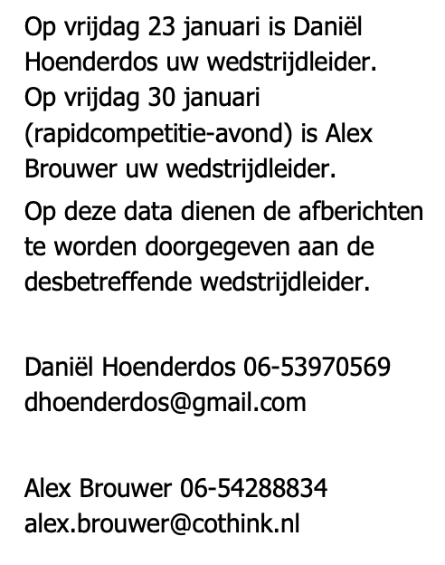 In de jaren tachtig van de vorige eeuw was er bij de STER-reclame een spotje over margarine. Zeeuws meisje heette dat. Geen idee of dat nog te verkrijgen valt, maar de uitspraak “Ons bin zuunig” is mij bijgebleven. Dat slaat dus op ons, de Nederlanders. En dat blijkt te kloppen, ook wanneer het om onze infrastructuur gaat. De Zwitsers, Oostenrijkers, Belgen, Noren en alle andere Europeanen lachen ons uit op het moment dat er meer dan 3 cm sneeuw in Nederland valt en ons treinverkeer hierdoor zodanig wordt ontregeld dat er nagenoeg geen treinen meer rijden. Hetzelfde geldt voor het vluchtverkeer. Nu weet ik niet wat de reden is geweest voor onze externe collega’s van Schaakmat om niet op onze club te verschijnen voor een bondswedstrijd, maar daar hadden ze ons toch wel van op de hoogte mogen stellen. Misschien lag het ook aan de infrastructuur. Ik hoop in ieder geval dat ze niet zijn overvallen door sneeuwjacht en dat iedereen veilig en gezond is gebleven.