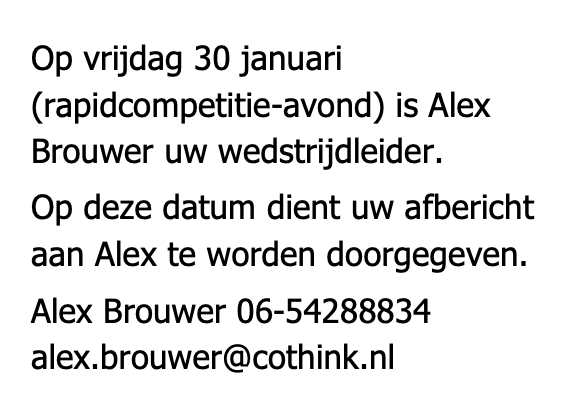 Op vrijdag 23 januari onder leiding van de kersverse wedstrijdleider Daniël Hoenderdos werden 9 partijen geschaakt. Hartelijk dank voor het maken van de indeling Daniël.