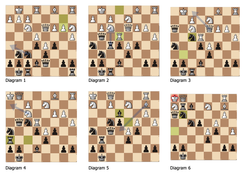 In diagram 4 laat ik mijn Dame in staan. Expres, die mag niet geslagen worden. (Voor degene die het niet meteen ziet, zet de stelling maar eens op een echt bord en kijk wat er allemaal kan gebeuren.) Ik was hier zelf zeer over in mijn nopjes, maar de engine van Lichess beoordeelt mijn torenzet naar h6 als een enorme blunder. Van +3.3 weer naar 0.0. Maar ja, tijdnood hè!