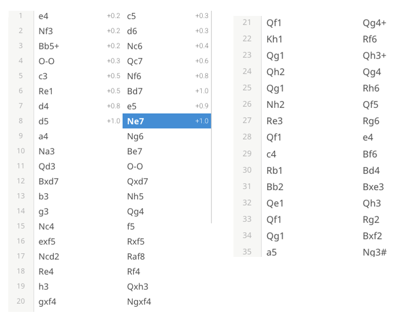Op zet 28…,e4. Ik sta nu ineens 2.9 punten achter. Gelukkig heeft mijn tegenstander nu ook last van die tijdscontrole. Hij besluit tot de zeer matige zet 29.c4. Prachtig. Ik wilde heel graag mijn inactieve loper activeren, en dat kan nu met tempo.29….,Lf6 30.Tb1,Ld4. Fabio blijft hierna geen goede zetten meer vinden. 31.Lb2 is dramatisch, want ik pak een volle toren terug op e3. Als wit besluit om die loper te pakken volgt een vork met Pg3+ en de dame valt. Maar wat nu gebeurt is nog veel slechter.