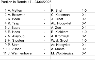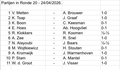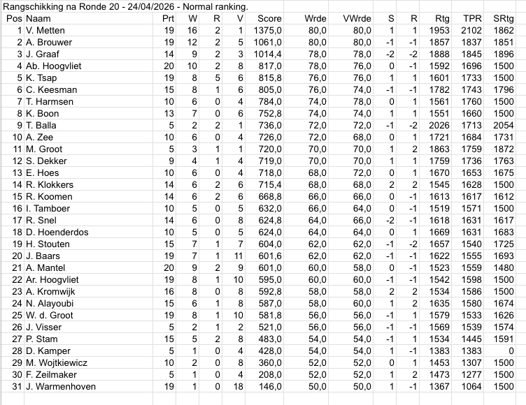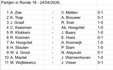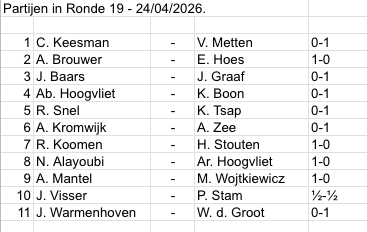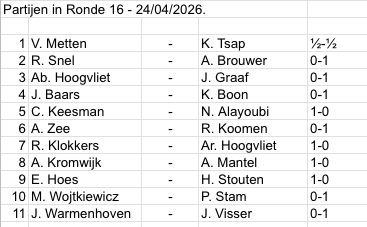 Op vrijdag 24 april werden de laatste 5 ronden van de rapidcompetitie gespeeld. En wie staat er bovenaan? Het zal Metten weer eens (niet) zijn. Vasco die alleen tegen Jeroen Graaf en Khrystyna Tsap een halfje moest laten liggen in 19 partijen (1x een bye), en een vol punt tegen Brouwer verloor, wist voor de rest alle partijen met winst af te sluiten. Brouwer speelde op zijn beurt ook fantastisch. Met uiteindelijk 2 remises en 5 verloren partijen heeft Alex de tweede plek behaald. Graaf had vanwege deelname aan TATA 5 ronden gemist, maar wist toch als derde te eindigen. In de laatste partij van de avond was Khrystyna Tsap een blok aan zijn been. Tsap speelde eerder op de avond al remise tegen Metten, en speelde de laatste partij van de rapidcompetitie zeer sterk en wist zodoende van Graaf te winnen.