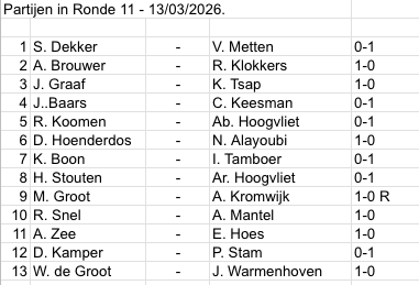 Op vrijdag 13 maart was het weer gezellig druk in de Nieuwe Doelen. Met 25 deelnemers hadden we oneven aantal wat resulteerde in dat enkelen een ‘bye’ kregen. Wat opviel was dat Vasco Metten een mindere avond had. Verloren van Brouwer, nou ja, dat kan. Maar remise in een snelschaakpot tegen Graaf is toch wat ondermaats voor zijn snelschaakkwaliteiten. Desondanks staat hij nog steeds bovenaan. Abel Hoogvliet wint dan weer van Brouwer, en verliest van Metten. Maar Abel heeft toch nu ook weer bewezen een koele kikker te zijn wat betreft de rapidcompetitie. Heer Hoogvliet heeft plek 4 op de ranglijst weten te veroveren, een zeer knappe prestatie! Een ander jeugdig lid heeft op plek 5 haar positie ingenomen. Met helaas een verliespartij aan het begin van de avond waarin ze veel beter stond, heeft Khrystyna meerdere potten gewonnen en sloot af met een remise tegen Marco Groot. En die had ze ook moeten winnen aangezien Groot nog maar 5 seconden op de klok had, en mevrouw Tsap nog ruim 2 minuten. De nieuwe leden Boon en Baars weten zich ook goed te handhaven op de rapidavonden.